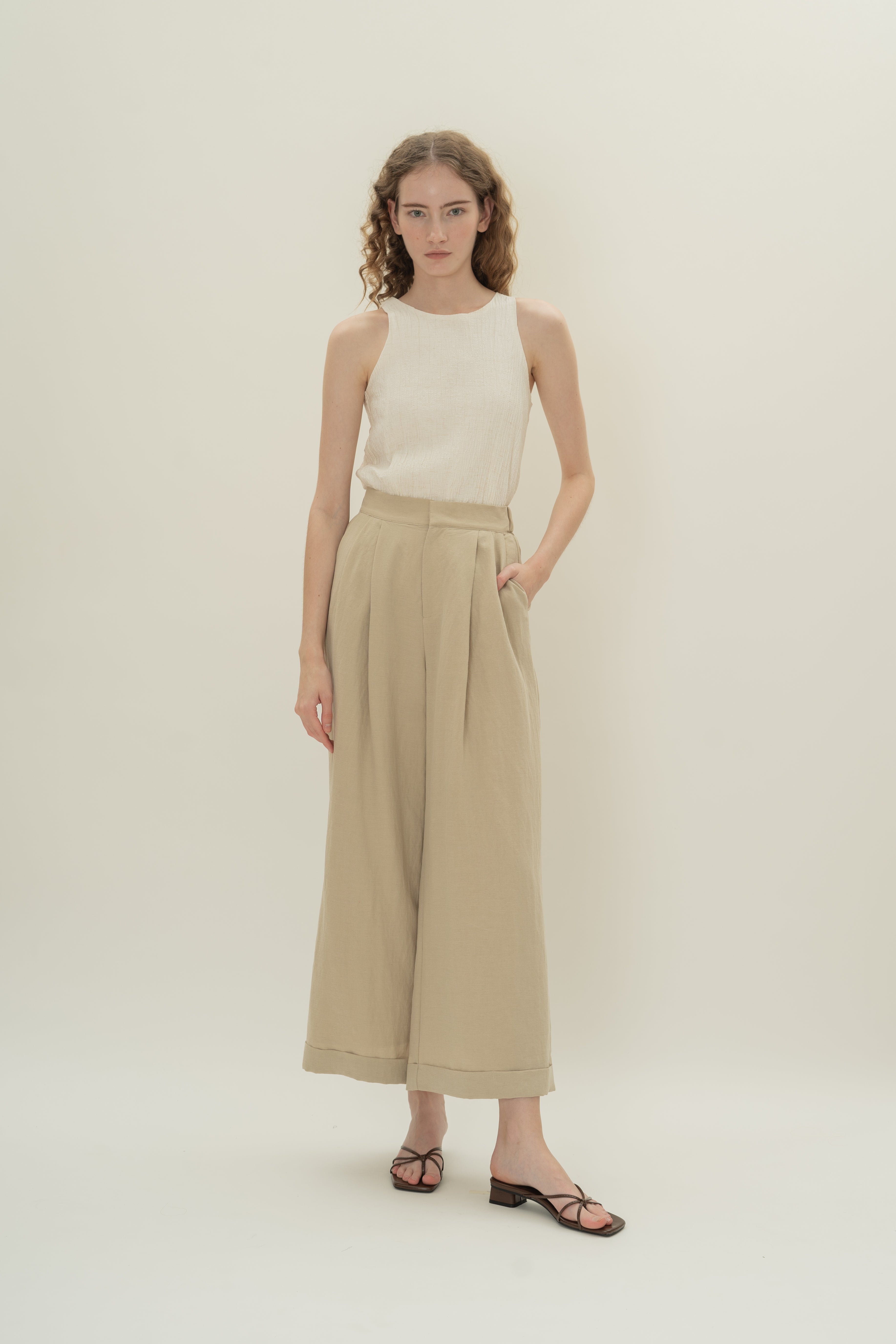 A softly tailored piece designed for all-day comfort. These wide-leg pants crafted from a breathable linen-polyester blend drapes easily to a gentle flare, with a pleated front that offers a soft, fluid shape, balanced with the ease of an elasticated back.